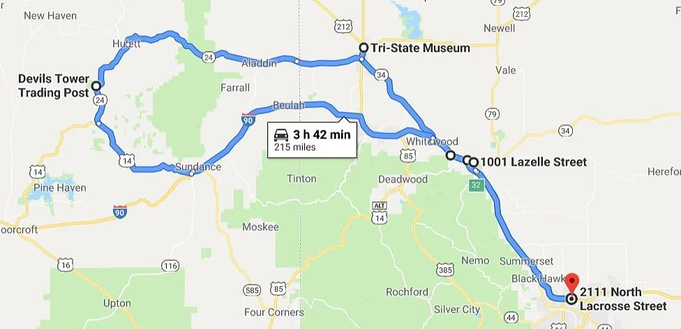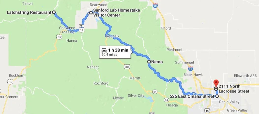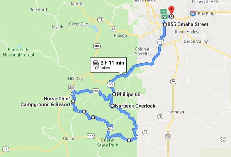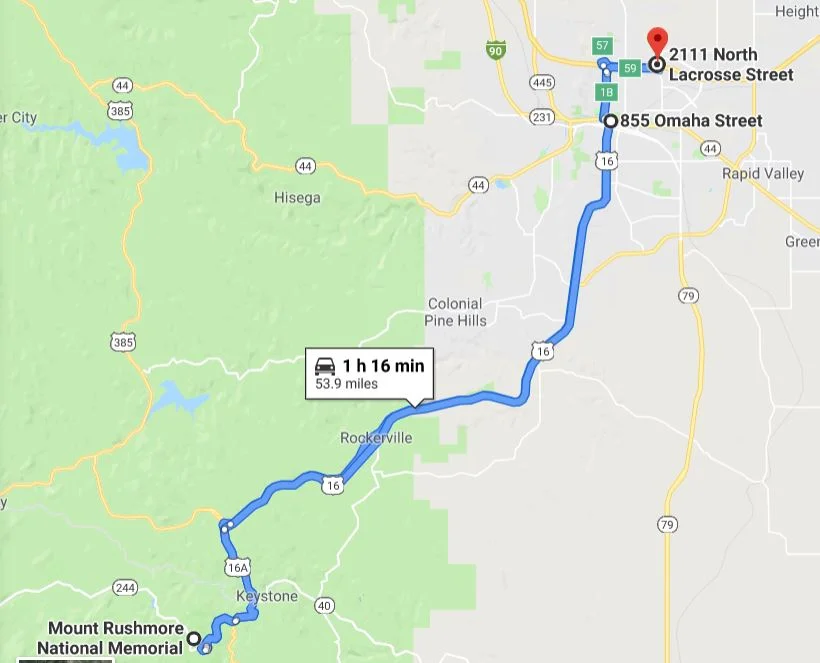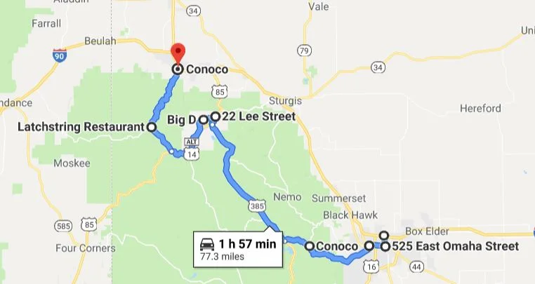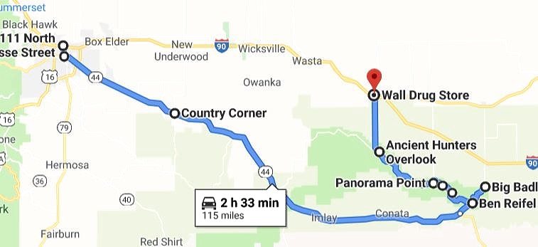 All but one of the routes (Devils Tower) start by heading south out from the hotel on Lacrosse Street over the interstate. About 1.7 miles south of the hotel the routes take SD-44 (Omaha Street) either east (Badlands Run) or west for the other runs to Spearfish Canyon, Custer State Park (Needles Highway), Mt. Rushmore and Crazy Horse.